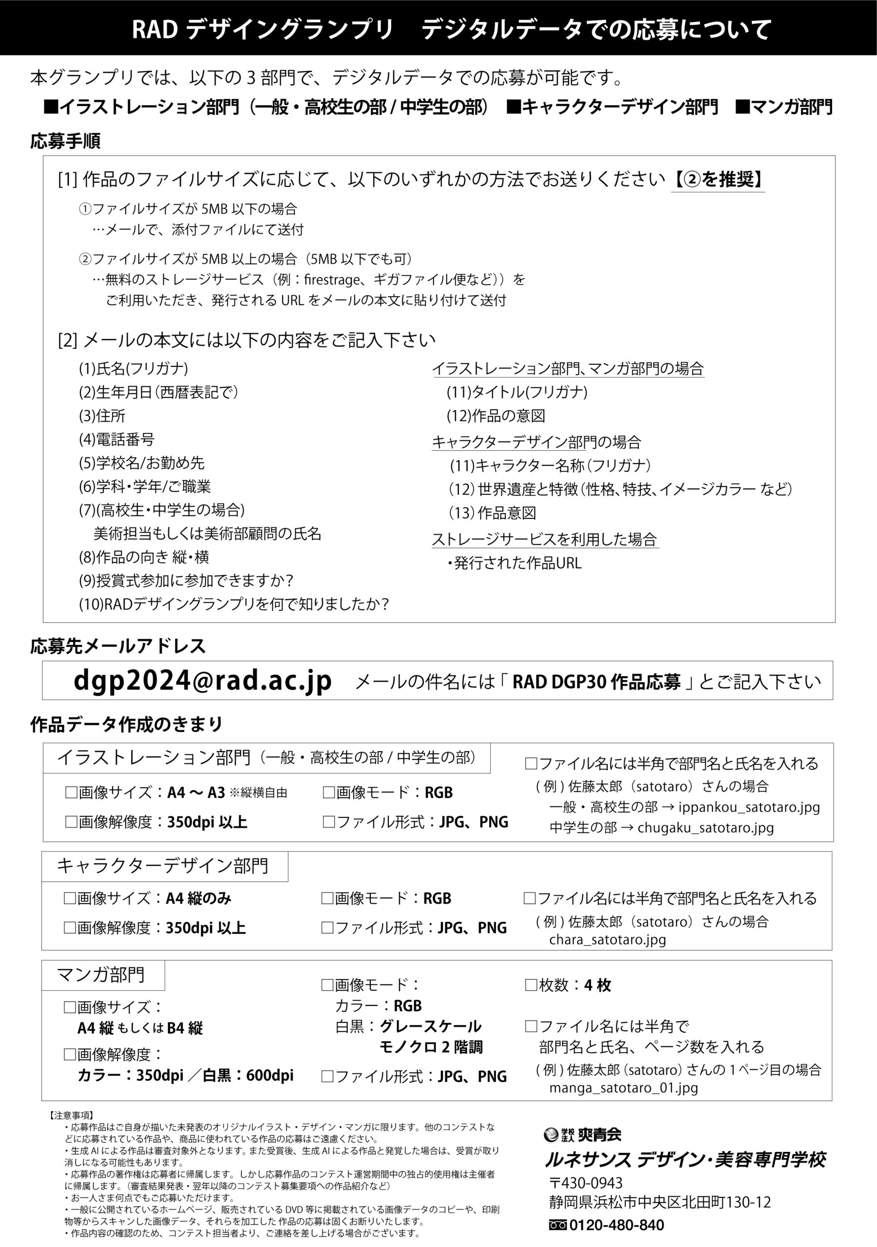 | 作品送り先 | 郵送:〒430-0943 浜松市中央区北田町130番地の12 メール:dgp2024@rd.ac.ntr-dev01.net |