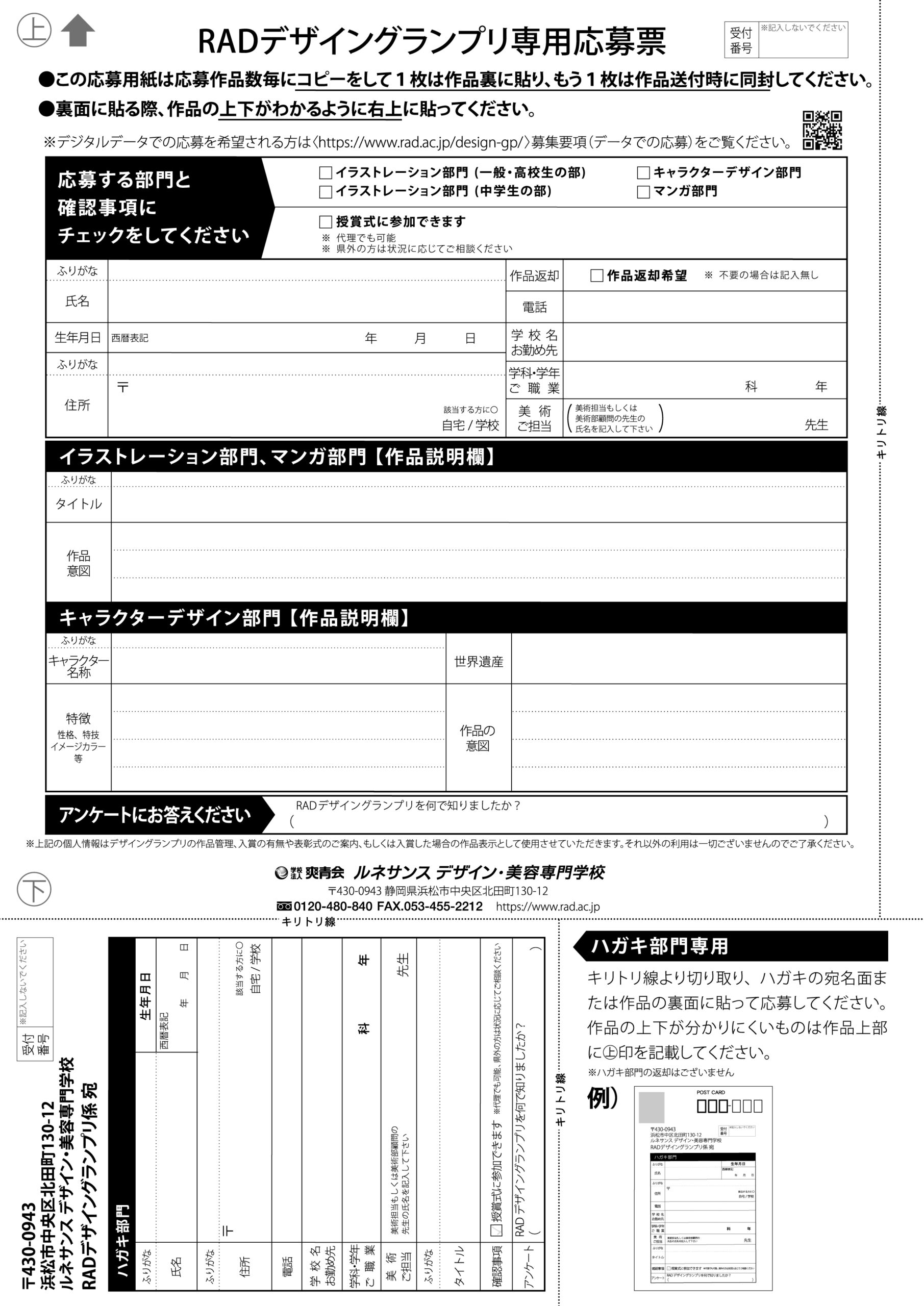 | お問い合わせ | RADデザイングランプリ フリーダイヤル 0120-480-840 TEL.053-452-2121 FAX.053-455-2212 |